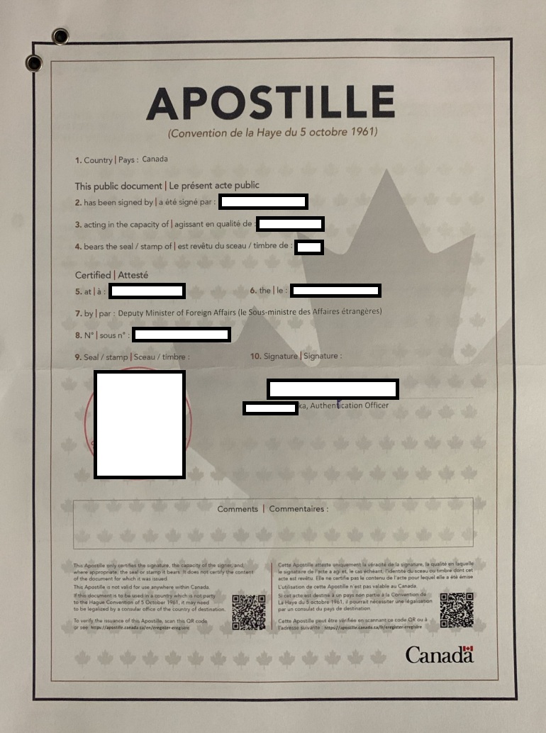 The image shows an official Apostille certificate issued in Canada in accordance with the Hague Convention.